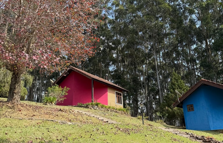 Cada chalé carrega uma cor própria, como se guardasse um fragmento da paleta da natureza. No gramado, esculturas e formas artísticas dialogam com o espaço, celebrando a criatividade que brota da terra.